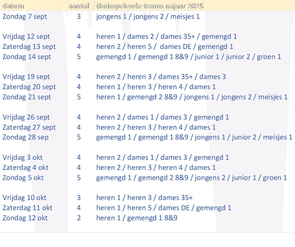 Vanaf 12 september 2025 doen 27 teams van Never Out Houtrust mee aan de najaarscompetitie. Op de vrijdagavond hadden we te veel aanmeldingen, waardoor we 1 team helaas niet hebben kunnen indelen. Door hieronder op een van de teams te klikken kom je op de webpagina van de KNLTB met de wedstrijden. Een uitleg over hoe de competitie werkt, kun je vinden bij Competitie uitleg.